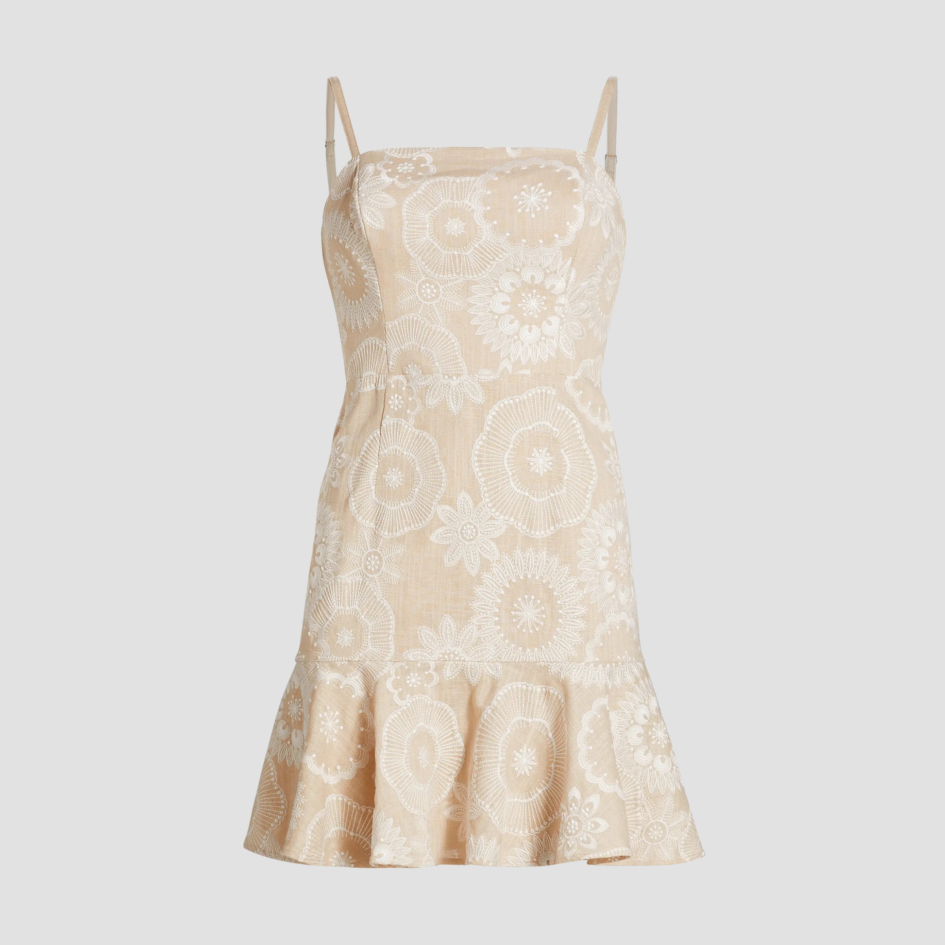 Milly’s beige mini dress features delicate white floral embroidery on a soft linen blend. With slender spaghetti straps and a fitted silhouette, it’s elevated by a contrasting medallion pattern and a flattering peplum hem for subtle sophistication.