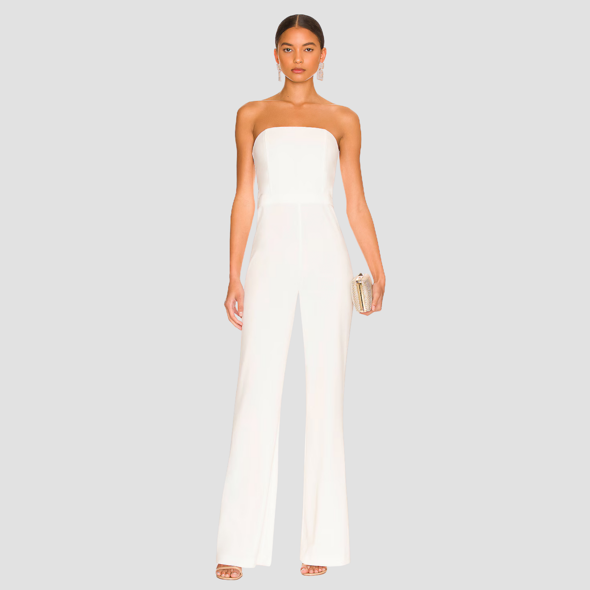 This Lavera Jumpsuit features a boned bodice with a non-slip silicone grip lining at the neckline for a secure fit. It includes an exposed back zipper closure and a detailed back panel design. Crafted from luxurious crepe fabric, it requires dry cleaning to maintain its elegance.