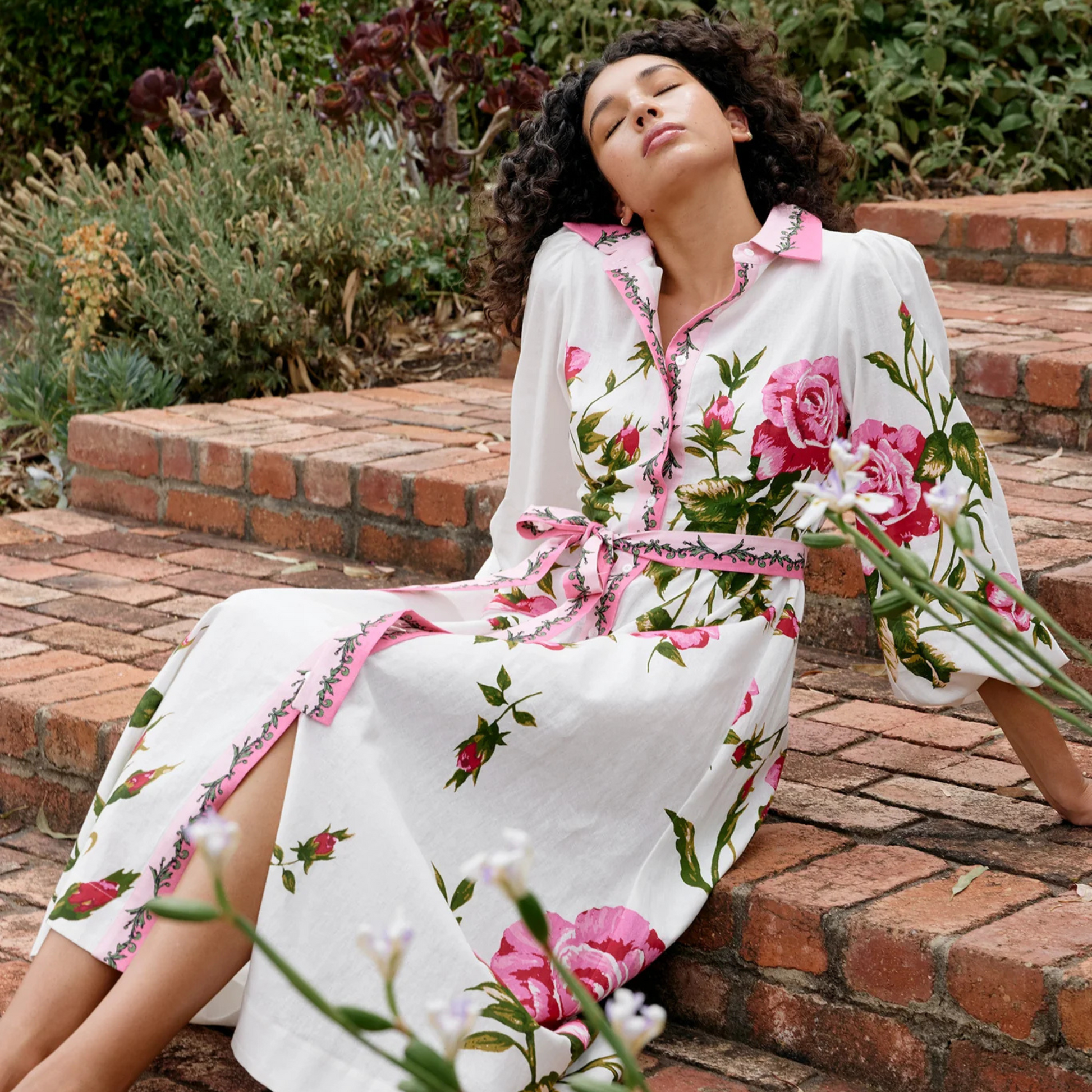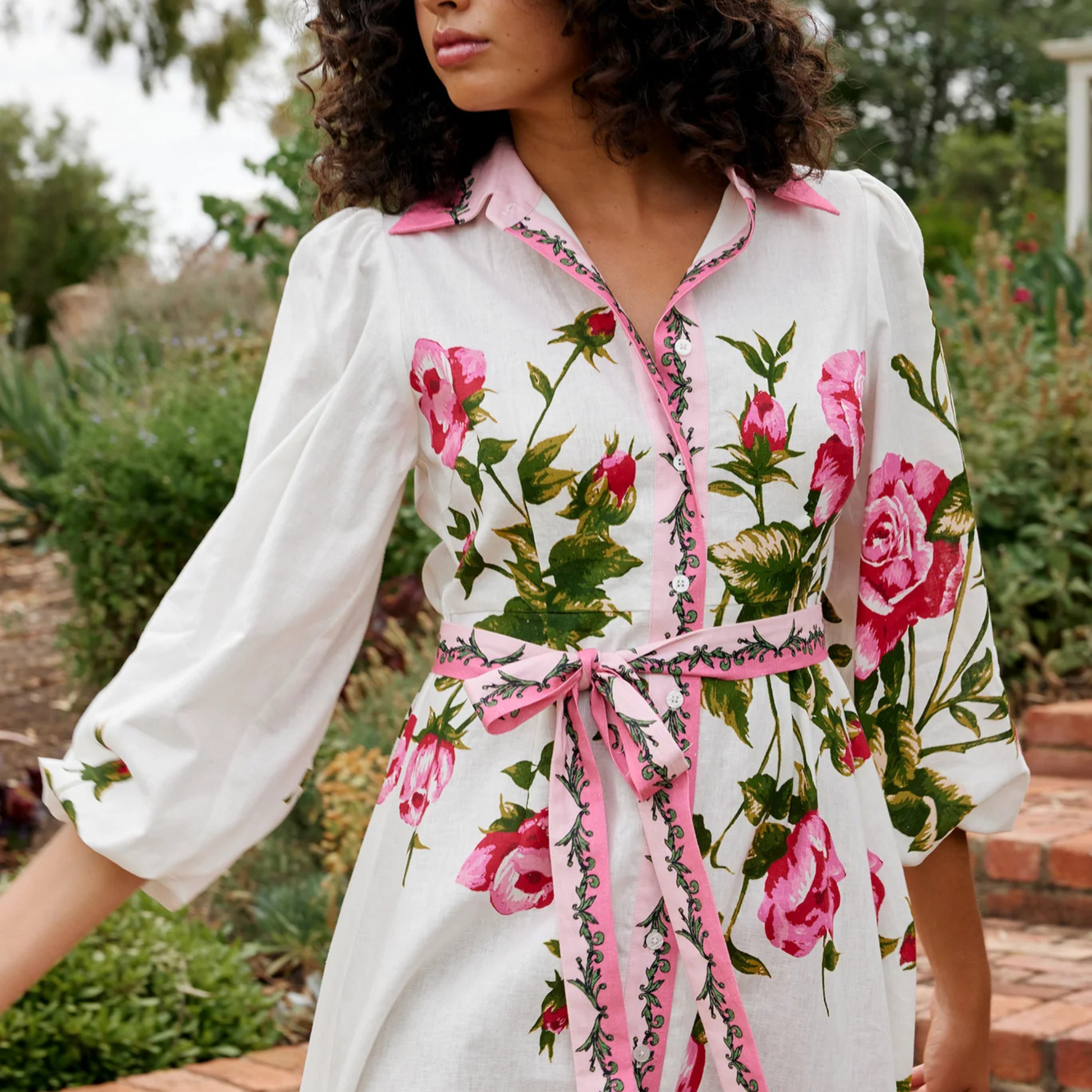 The Lucille Dress in Antique Rose exudes effortless elegance with its romantic pink rose print on a crisp white backdrop. Featuring a button-down front, delicate embroidered trim, and a matching fabric belt to cinch the waist, it creates a flattering silhouette. The billowy sleeves add a touch of vintage charm, making it a perfect blend of femininity and sophistication.