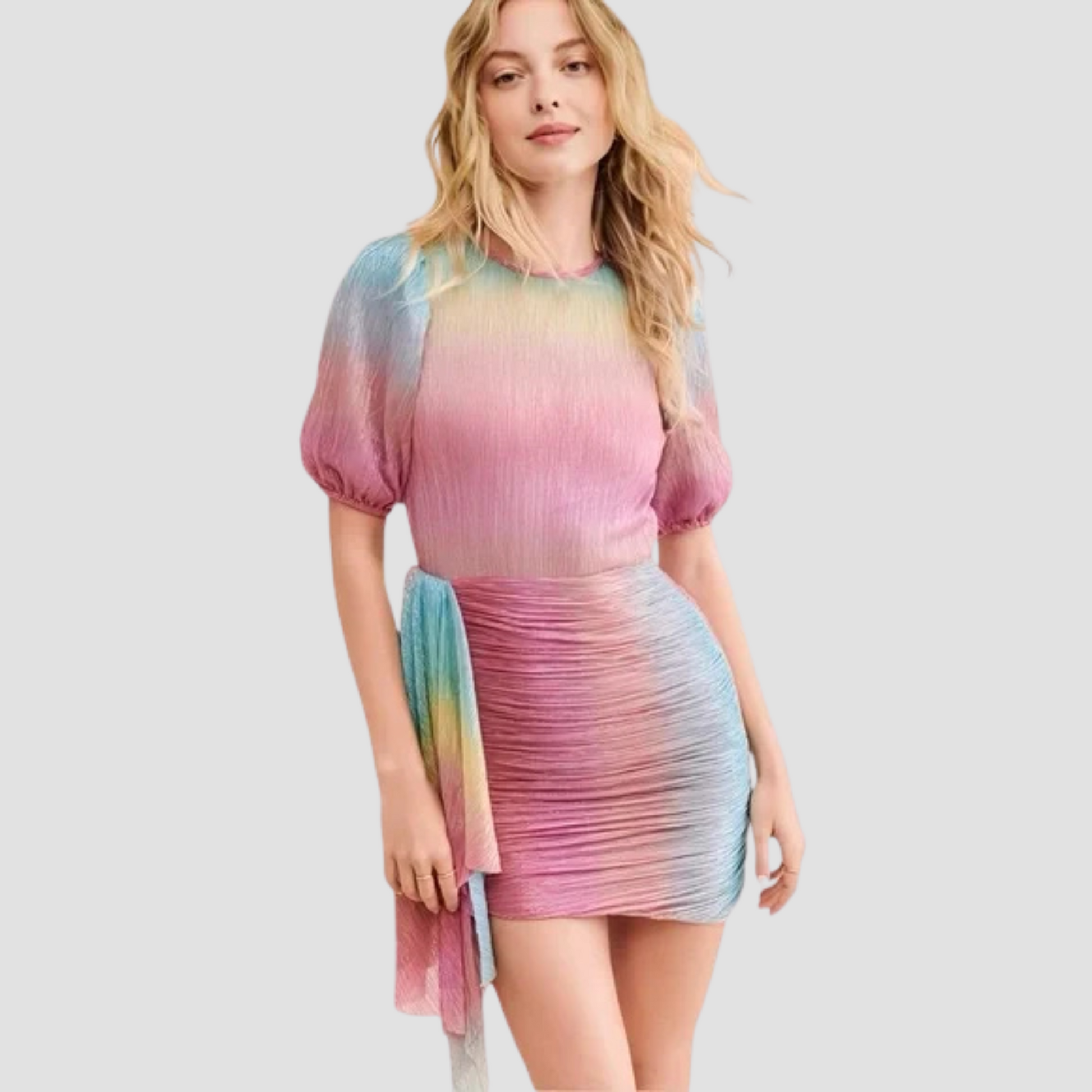 The Saylor Orpha Ombre Mini Dress features a stunning multicolor gradient and elegant puff sleeves. This sophisticated piece offers a flattering silhouette, perfect for adding a touch of bold and beautiful to any party.