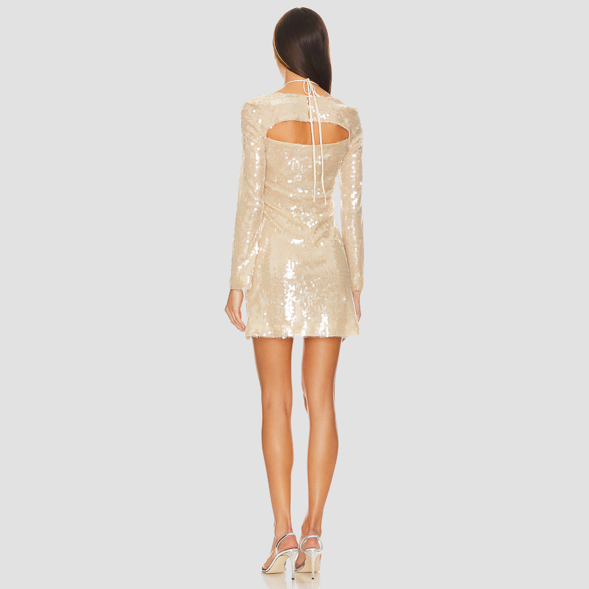 This sophisticated mini dress features full sequin coverage with long sleeves and a stylish keyhole cutout at the neckline, offering a refined and glamorous look for any special occasion.