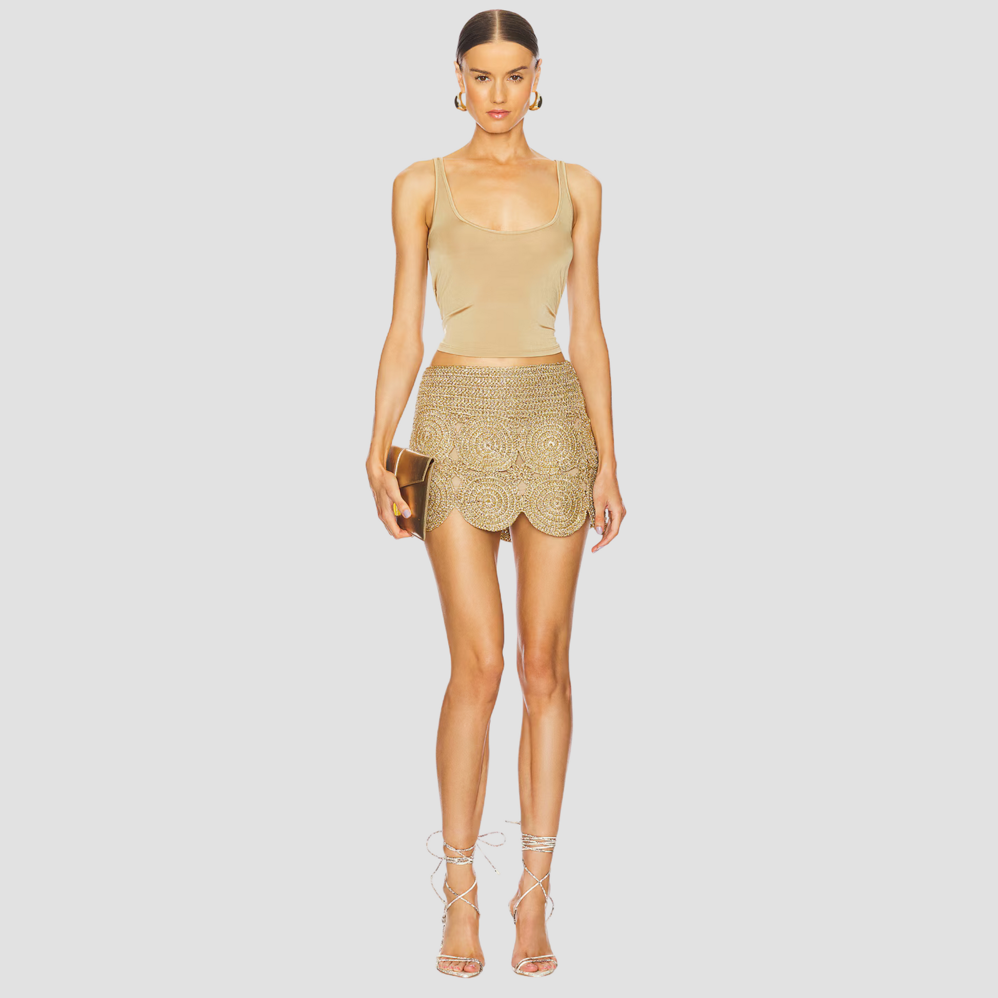 Elevate your wardrobe with the Simon Miller Mini Skirt, expertly crafted with woven gold thread for a subtle yet striking shimmer. This piece combines refined texture and a flattering silhouette, making it ideal for both sophisticated daywear and elegant evening occasions. Its meticulous construction ensures durability while maintaining a lightweight feel, offering comfort without compromising style. Perfect for those seeking a statement skirt that balances luxury and versatility.